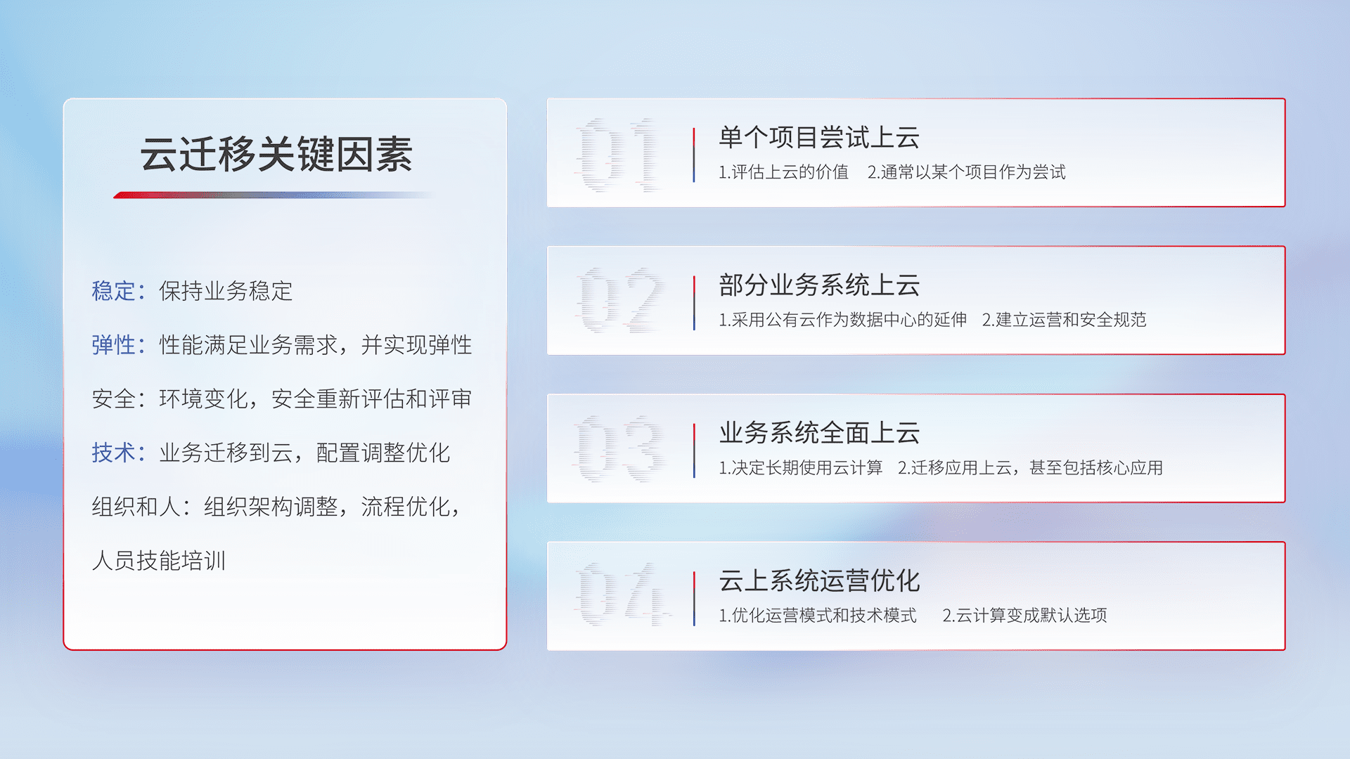 结合实际业务,,,从规划设计、、云平台选型、、云原生改造、、数据迁移、、、、集成交付,,,,迁移全过程为客户识别最佳上云路径,,,,做好风险识别管理,,,设计网络架构、、、身份权限、、、、安全审计合规、、操作审计、、日志审计、、监控告警策略、、、多站点容灾设计等,,,对云上基础设施进行整体规划,,,提升IT治理水平,,,,以满足弹性、、、、高可用、、、、高性能的需求。。。