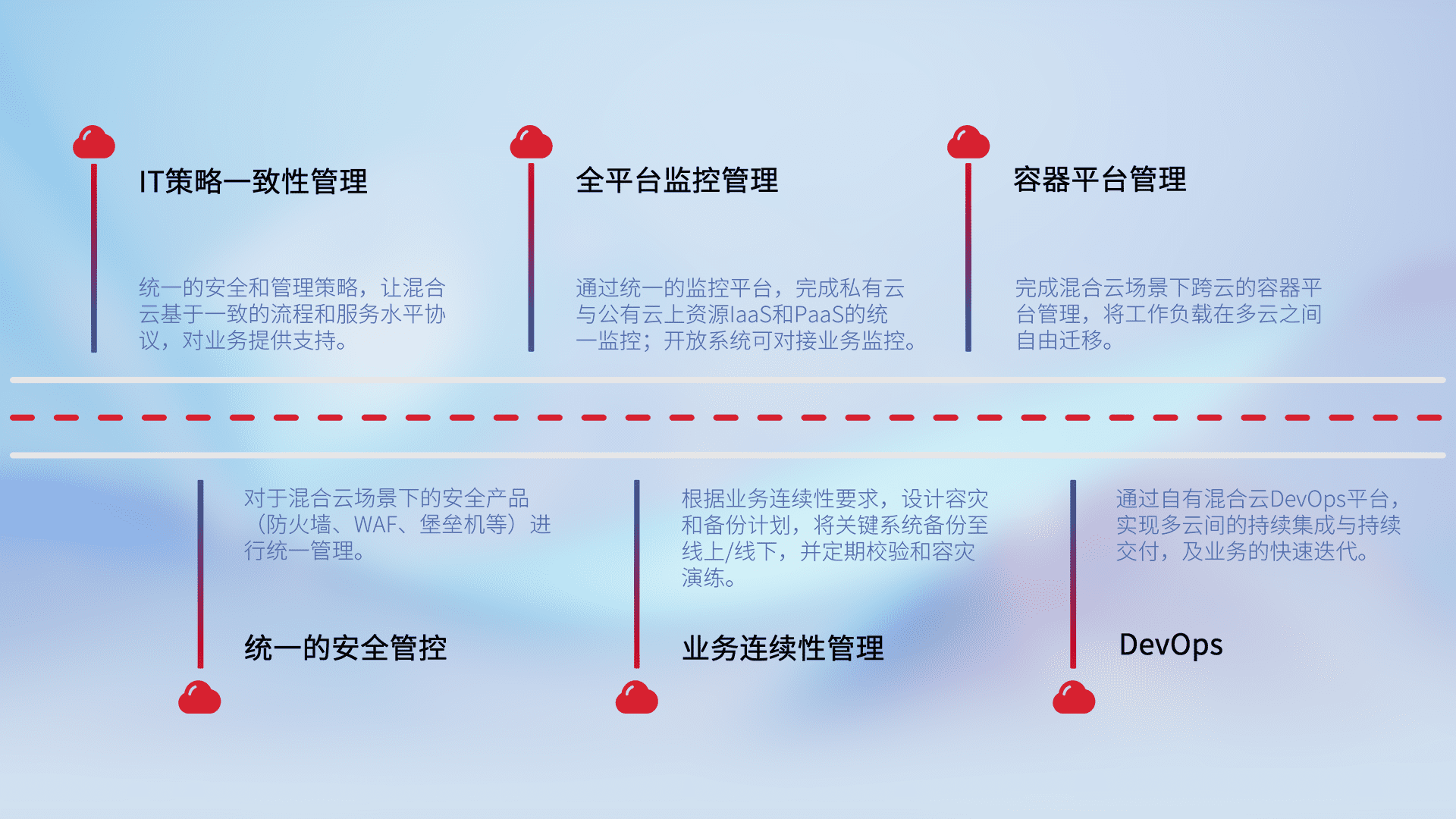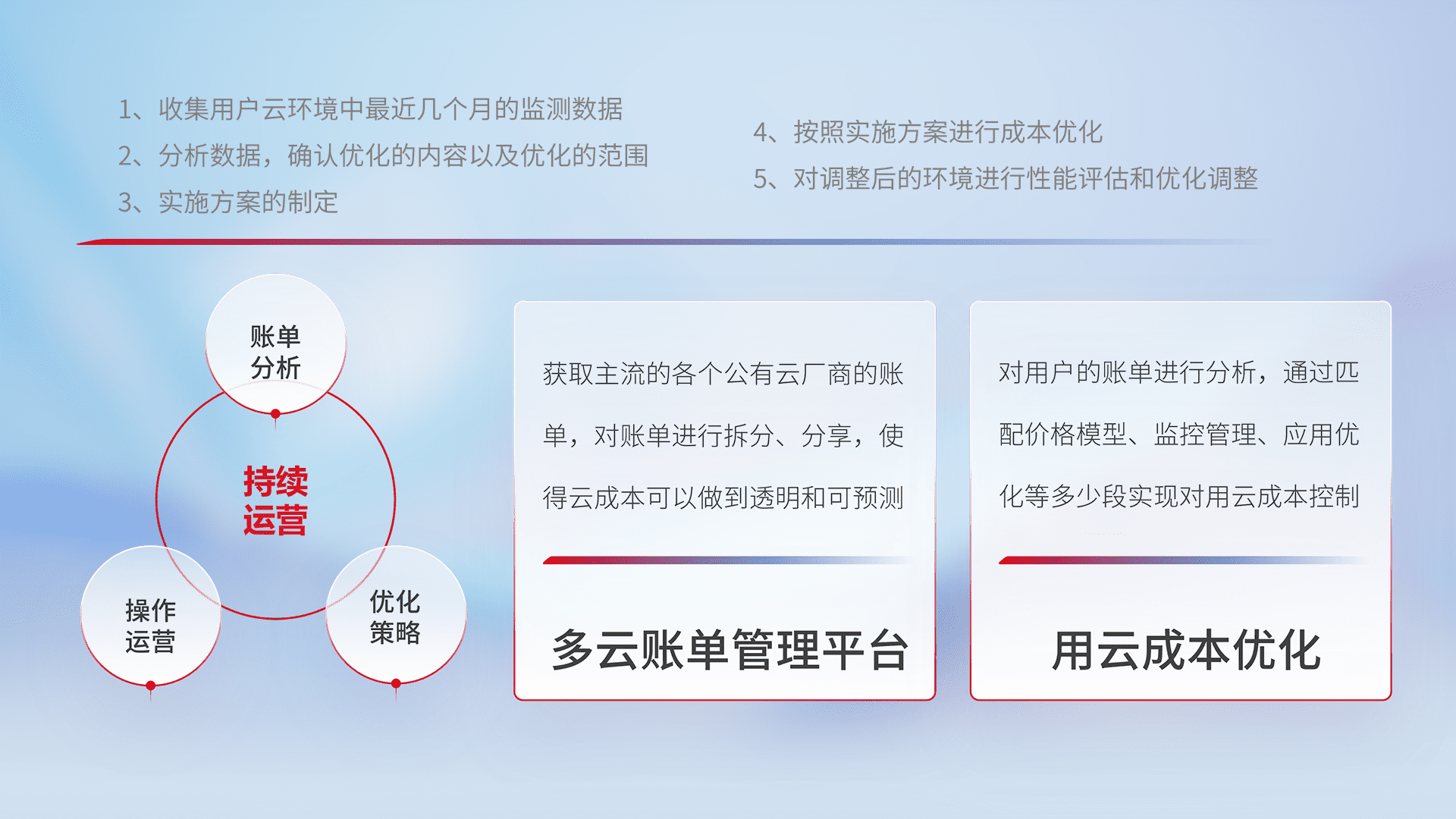 通过多云纳管,,,以统一的资源数据模型把客户的云资源进行抽象和封装,,进而实现对多云资源的统一操作,,保障云资源管理的可靠性、、、、稳定性与可用性。。量身定制化运维内容,,配置、、、、开发运维、、补丁管理、、备份、、、监控、、、、认证和访问管理、、、审计和日常巡检等,,保障在用云过程中的可靠度,,稳定度以及高可用率。。。。