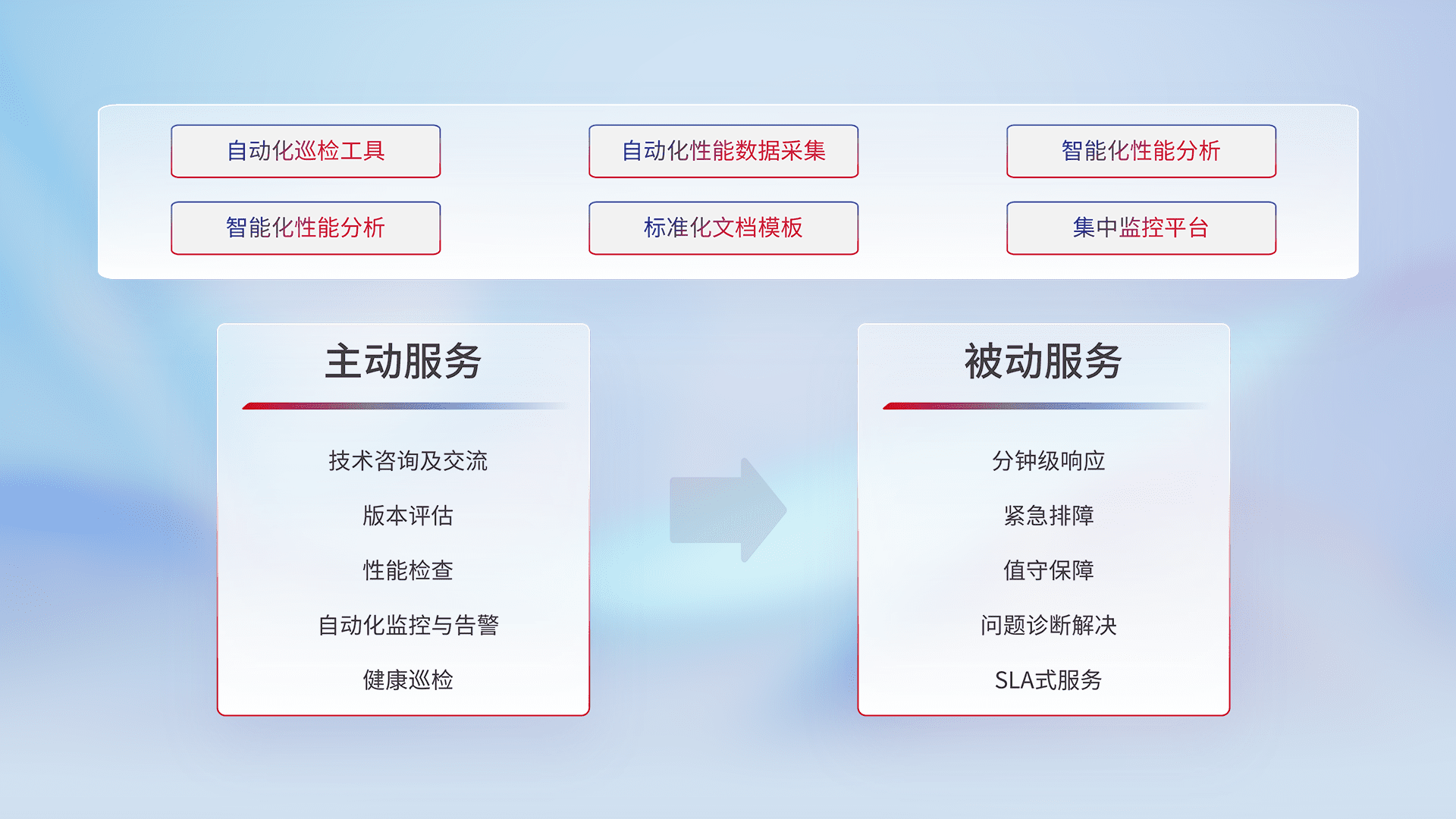 智能化工具和标准化文档,,保障服务质量,,,提供主动服务(包含技术咨询、、、版本评估、、性能检查、、、自动化监控与告警、、健康巡检)和被动服务包含(分钟级响应、、、紧急排障、、、、值守保障、、、、问题诊断解决、、、、SLA服务)。。。