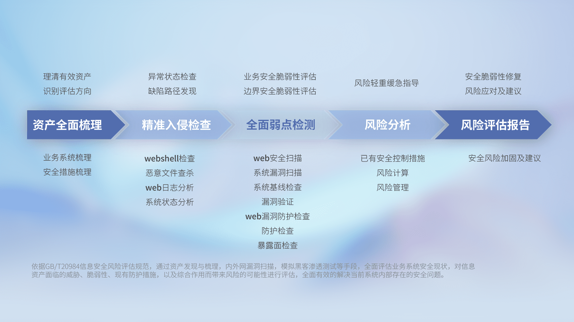 针对客户行业特性,,以专业的安全服务+多厂商联合解决方案提供专属的一站式安全管理服务,,帮助客户全面感知网络空间威胁,,基于识别、、、检测、、、、分析、、、、防护、、、监测、、、、响应的服务理论模型,,,从方案咨询、、、、集成交付、、、、评估验证、、优化加固、、、运维运营,,致力于为客户提供完整的闭环管理式安全服务。。。以实战经验为客户打造高抵御风险的安全体系,,,帮助客户发现威胁、、对抗威胁、、、处置威胁,,,不断积累安全对抗能力,,持续保障数字化安全。。。。